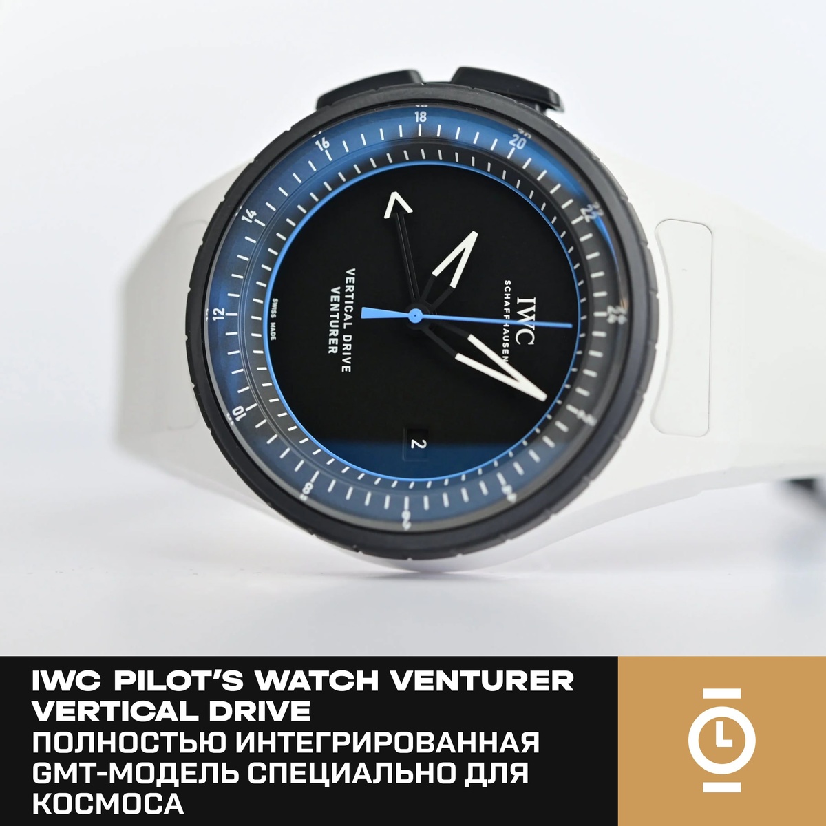 #WW_WD На Watches & Wonders 2026 компания IWC Schaffhausen представила одну из самых технологичных новинок — Pilot’s Watch Venturer Vertical Drive. Модель разработана совместно с компанией VAST и стала первыми часами бренда, изначально спроектированными для использования в космосе. Корпус выполнен из белого оксида циркония (керамики) и дополнен безелем из Ceratanium — фирменного материала, сочетающего лёгкость титана и твёрдость керамики. Задняя крышка и элементы управления также изготовлены из Ceratanium. Размеры внушительные: 44,3 мм в диаметре и 16,7 мм толщины, что обусловлено необходимостью удобного управления в перчатках. Главная особенность — полный отказ от традиционной заводной головки. Управление осуществляется через боковой рычажный переключатель и вращающийся безель. С их помощью можно заводить часы, настраивать время и управлять функцией второго часового пояса. Безель регулирует часовую стрелку с шагом в один час в обе стороны, обеспечивая полноценную GMT-индикацию, син