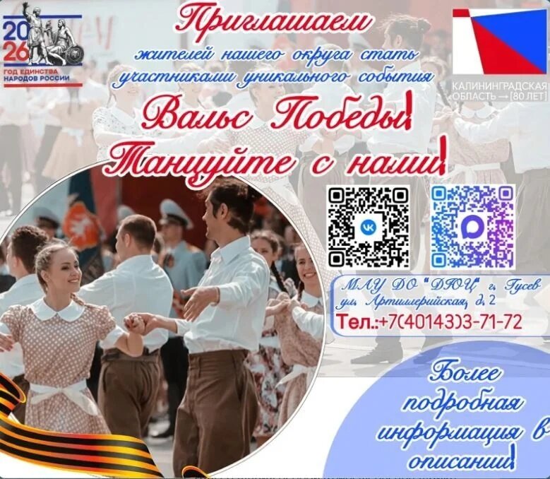 В Гусеве пройдёт патриотическая акция «Вальс Победы». Мероприятие приурочено к 80-летию Калининградской области и годовщине Победы в Великой Отечественной войне, а также проводится в знак благодарности ветеранам и признания подвига участников специальной военной операции. Организатором выступает Детско-юношеский центр. В этом году к торжественному событию приглашают не только традиционные пары из мужчины и женщины или мальчика и девочки, но и дам, у которых нет партнёра, но есть желание присоединиться к танцу. Для создания праздничной атмосферы всех участников просят придерживаться определённого дресс-кода. Подробности о внешнем виде сообщат непосредственно на репетициях. Сами репетиции проходят каждый вторник и четверг в 18:00 в здании центра на улице Артиллерийской, дом 2. Организаторы надеются на поддержку жителей и предлагают приходить на акцию вместе с близкими и друзьями, ведь танец объединяет и помогает сообща сохранить память о героях. Задать вопросы и уточнить детали можно по