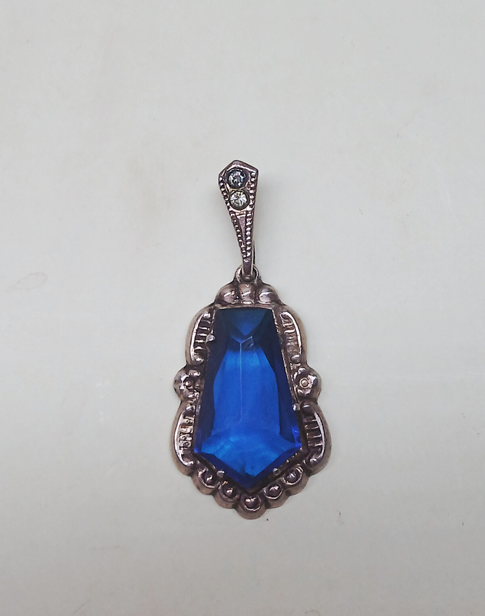 Антикварный кулон времен СССР со вставкой из камня синего цвета. Серебро 875 пробы, золочение. Размер 3,5 × 2 см, т.е. довольно большой.