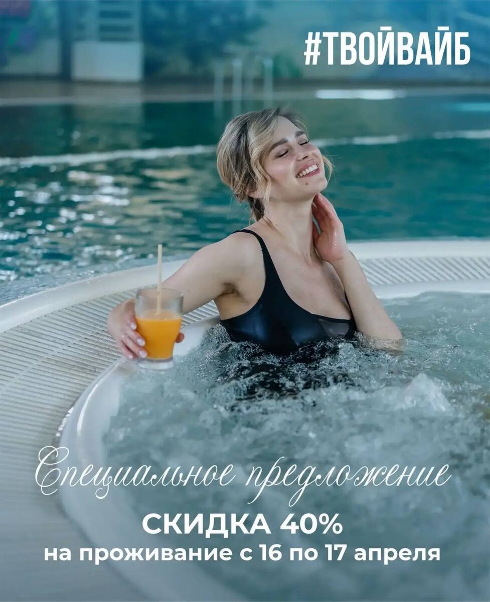 ! Забронируй номер на сайте с 16 по 17 апреля и получи скидку 40% и безлимитное посещение Велнесс-центра по промокоду #ТВОЙВАЙБ. https://arthurs-hotels.ru/aktsii/vesenniy-spa/ специальное предложение на спа-процедуры🌿 Как оформить: Перейди на наш сайт и выбери подходящий номер. Укажи даты проживания: 16–17 апреля. Введи промокод #ТВОЙВАЙБ в специальное поле при бронировании. Предложение не распространяется на ранее сделанные бронирования и не суммируется с другими акциями и предложениями. Бронирование проживания по телефону: +7(495)150-41-21 или онлайн на сайте: accor.ru/booking/?hotel_id=3862