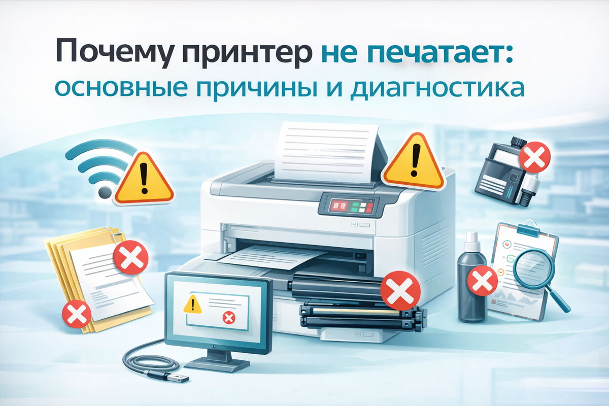 Современные принтеры — надежная техника, но даже они могут внезапно перестать печатать. Такая проблема может возникнуть как в офисе, так и дома, и часто требует быстрой диагностики и устранения. В этой статье разберем основные причины, почему принтер не печатает, и как правильно провести диагностику принтера. Одна из самых распространенных причин — отсутствие связи между принтером и компьютером. Это может быть связано с: Решение: проверьте кабели, перезапустите роутер и убедитесь, что устройство подключено к нужной сети. Если драйверы установлены неправильно или устарели, принтер может не реагировать на команды печати. Решение: обновите или переустановите драйверы через официальный сайт производителя. Иногда проблема банальна — закончилась бумага или произошел ее застревание внутри устройства. Решение: проверьте лоток подачи и аккуратно устраните замятие. Если картридж пуст или засох, принтер может не печатать или выдавать пустые листы. Решение: замените или заправьте картридж. Докумен