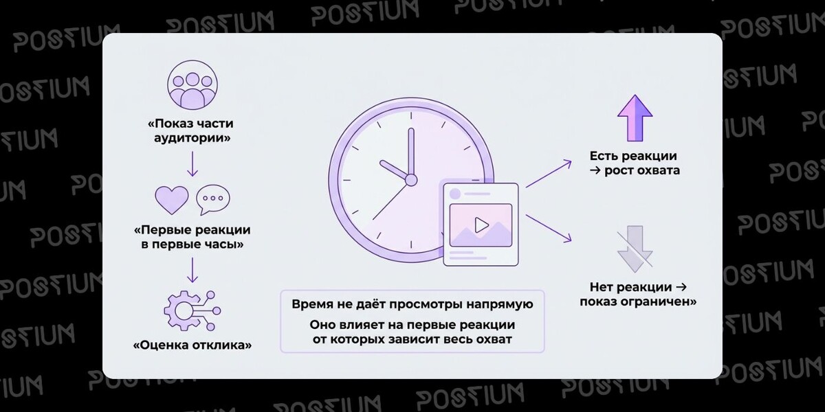 Если упростить: время влияет не на итоговые просмотры, а на шанс получить первые реакции, от которых дальше зависит весь охват.