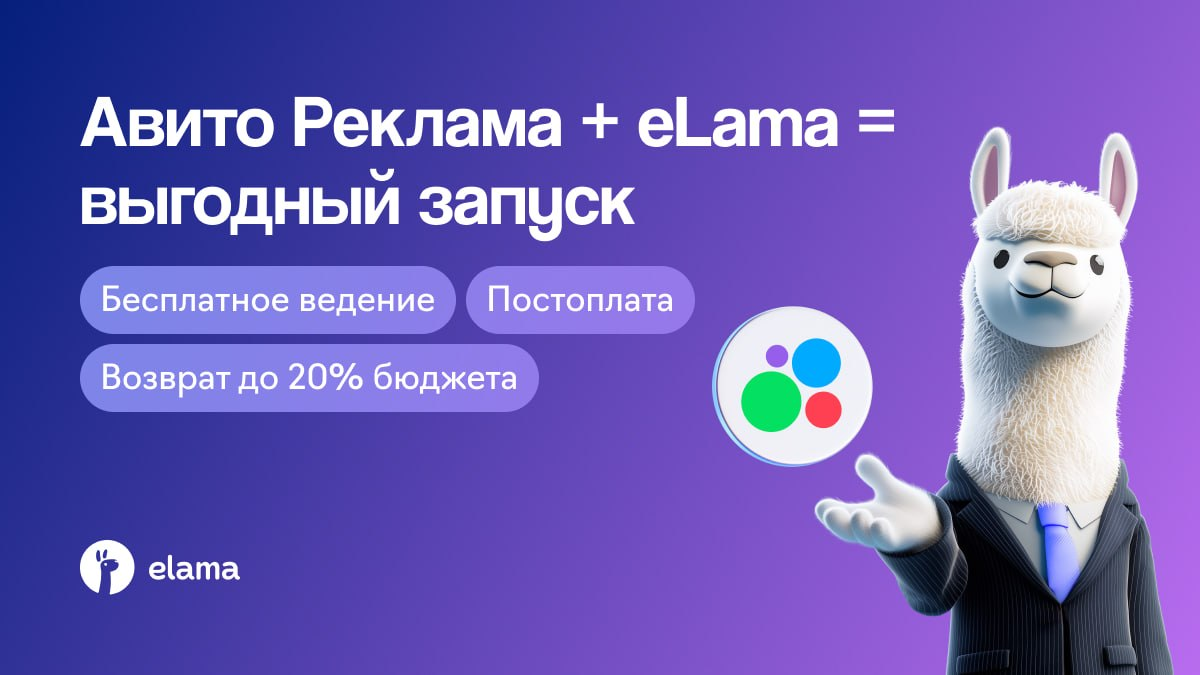 Авито — это уже давно не просто доска объявлений. Это мощная коммерческая платформа с аудиторией 72+ млн человек. И самое важное: пользователи приходят сюда не за контентом, а за конкретными товарами и услугами. Спрос уже сформирован — вам не нужно прогревать аудиторию с нуля. При этом для многих компаний Авито Реклама пока остается новым каналом, поэтому конкуренция здесь ниже, а стоимость трафика доступнее. Не откладывайте запуск кампаний, стартуйте прямо сейчас! А с eLama это удобно и выгодно: 1️⃣ Постоплата без комиссий и процентов