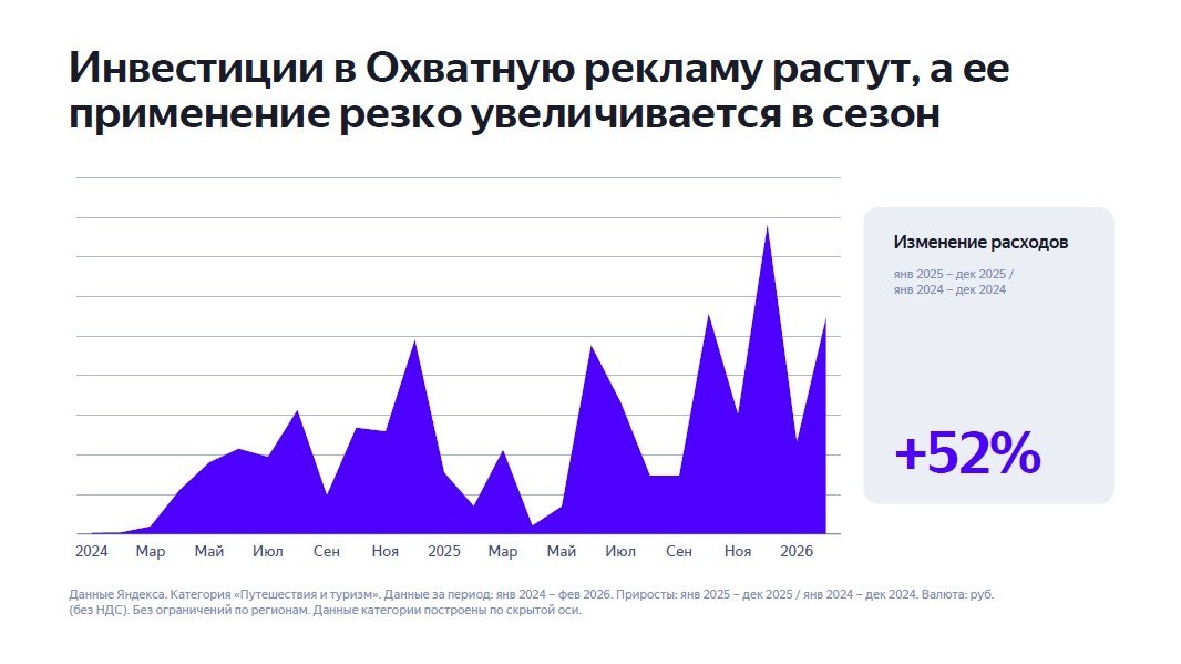 Инвестиции в охватные рекламные размещения в категории «Путешествия и туризм» выросли на 52% год к году, а ее применение резко увеличивается в сезон. При этом основная доля бюджетов по-прежнему приходится на баннеры и видео. Также важна не только своевременность и видимость, но и качество контента. У классических медийных баннеров средняя кликабельность держится в диапазоне 0,05–0,15% (в зависимости от выбранных настроек). У видеобаннера при той же логике размещения она в среднем выше на 12%. А если с видео добавлять карусель предложений, кликабельность растет еще на… Продолжение в канале ВК