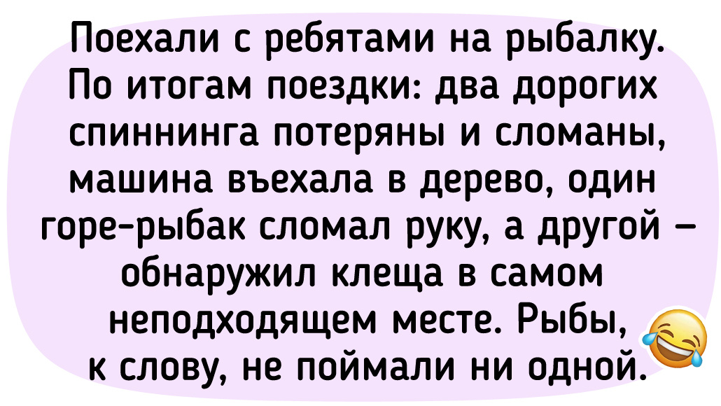 Поехали с ребятами на рыбалку. По итогам поездки: два дорогих спиннинга потеряны и сломаны, машина въехала в дерево, один горе-рыбак сломал руку, а другой — обнаружил клеща в самом неподходящем месте. Рыбы, к слову, не поймали ни одной.