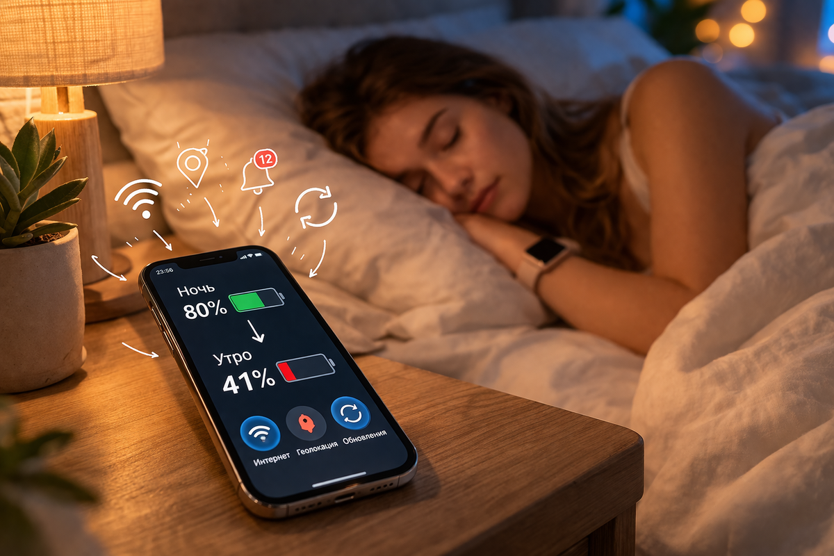 Ложишься спать — 80%. Просыпаешься — уже 40%. И самое странное: ты вообще ничего не делал. Ни звонков, ни видео, ни игр. Кажется, будто телефон просто “умирает сам”. Но нет — в этот момент он работает даже активнее, чем днём.