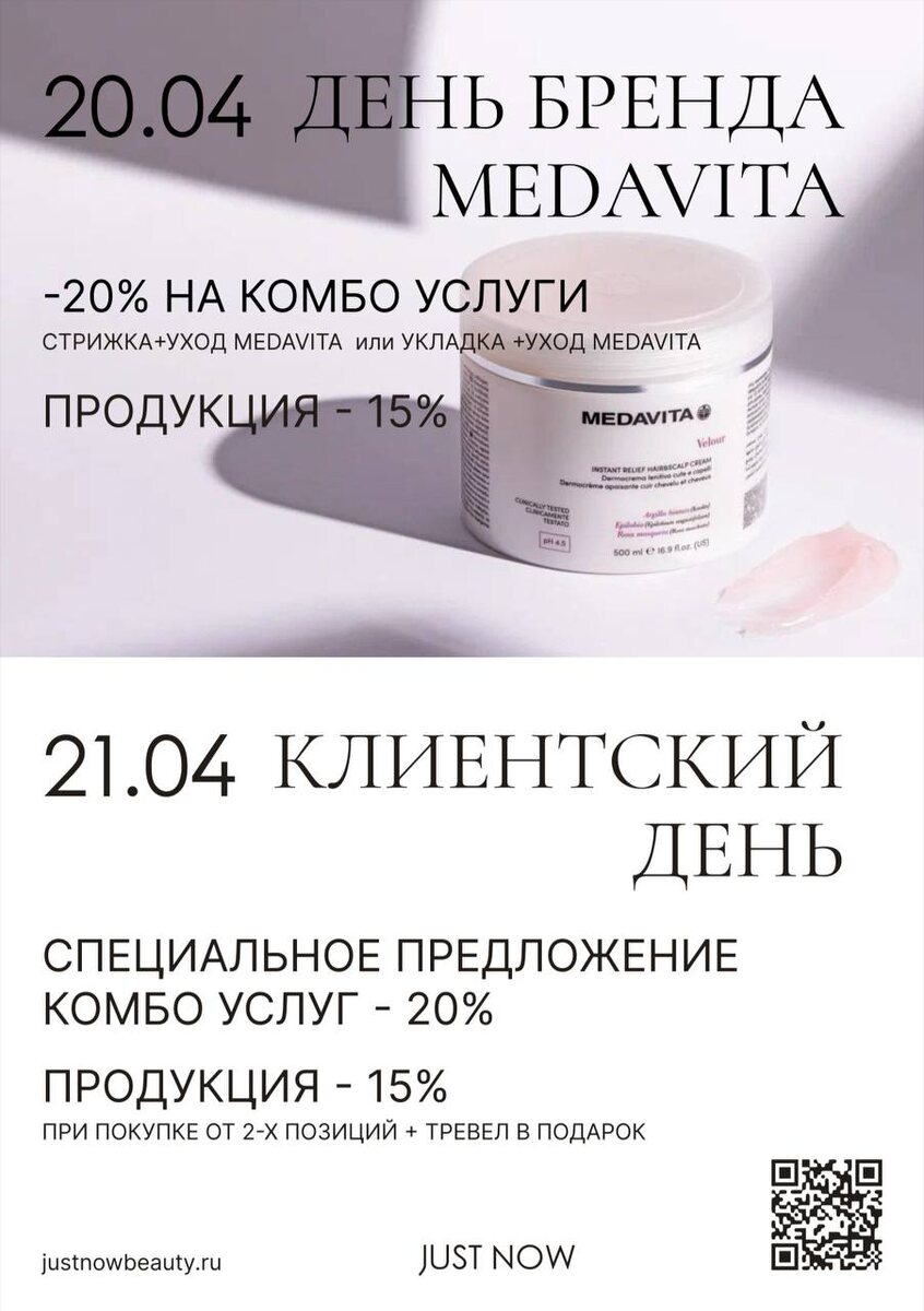 ❤️ 20.04 — День бренда Medavita — комбо услуги (стрижка + уход / укладка + уход) со скидкой -20% — продукция -15% — консультации по подбору ухода 21.04 — Клиентский день — комбо услуги -20% — продукция -15% — при покупке от 2-х позиций — тревел-формат в подарок Идеальный повод обновить волосы, попробовать уходы Medavita и забрать любимые средства по приятной цене ✨