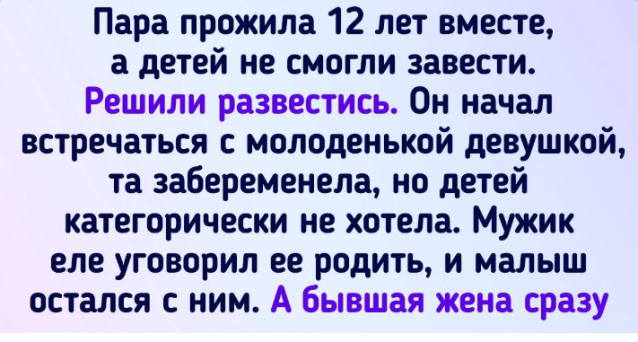 Слышала историю о несовместимости партнеров. Пара прожила 12 лет вместе, а детей не смогли завести. Решили развестись. Он начал встречаться с молоденькой девушкой, та забеременела, но рожать категорически не хотела. Мужик еле уговорил ее родить, и малыш остался с ним, так как желания иметь семью и ребенка у нее не было. А бывшая жена завела роман и практически сразу забеременела, но папаня слился. В итоге муж и жена снова сошлись и двоих детей воспитывают. © WildOrchidea