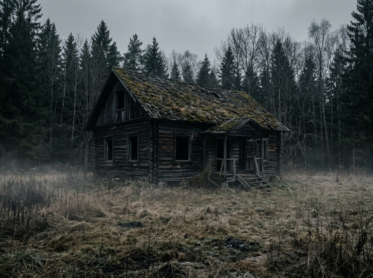 Он казался не просто старым, а ископаемым. Почерневшие, рассохшиеся брёвна, просевшая под тяжестью мха крыша, пустые тёмные окна, похожие на глазницы черепа. Он не просто стоял на земле, он врос в неё, стал её частью, как злокачественная опухоль.