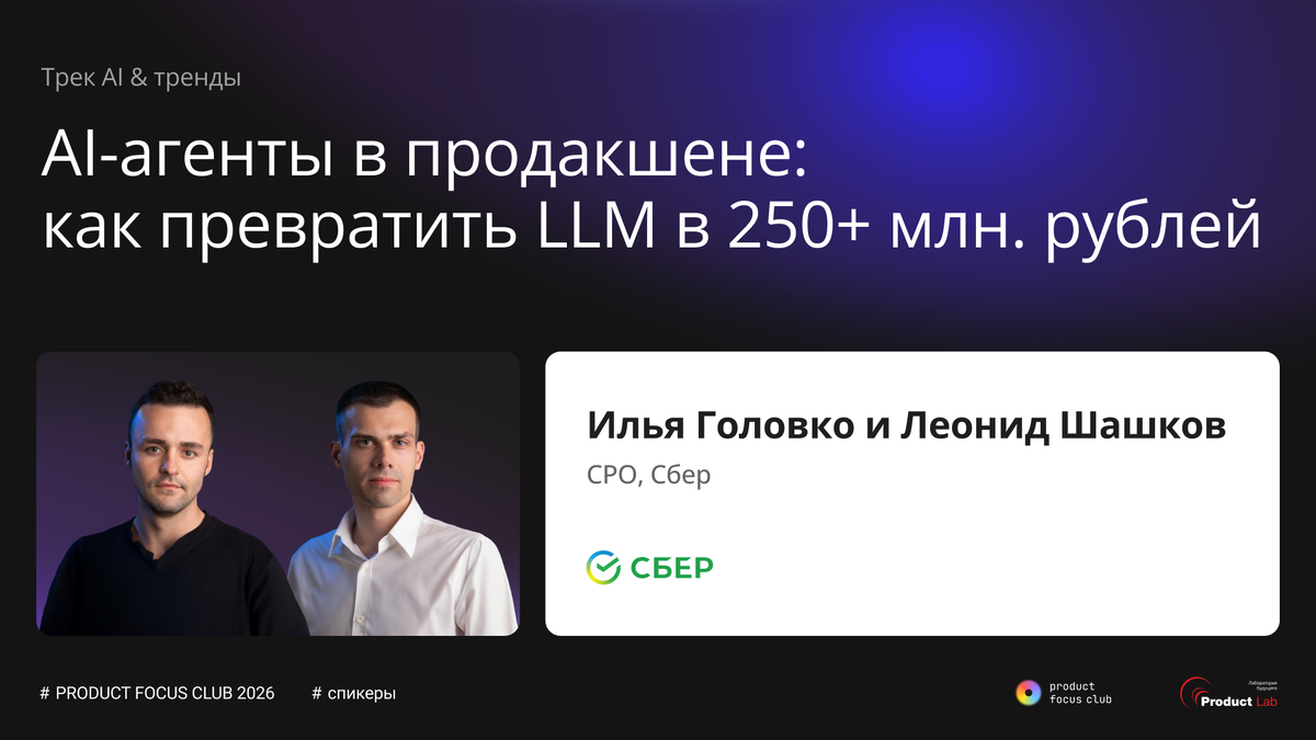 Сейчас почти каждая команда экспериментирует с AI и пытается автоматизировать все подряд. Но у большинства все заканчивается на уровне прототипов. До реального продукта, и тем более экономического эффекта, доходят единицы. 17 апреля Илья Головко и Леонид Шашков, CPO в Сбер, выступят на Product Focus Club 2026 и разберут кейсы, где AI действительно дошел до продакшена и начал приносить деньги. — как находить AI-кейсы с реальной экономикой — как превращать LLM-прототипы в стабильные продуктовые сервисы — как выстраивать взаимодействие product, data и engineering — как масштабировать AI через платформенный подход А еще разберут несколько реальных кейсов AI-агентов подачи сервисных заявок для сотрудников, поддержки и поиска по базе знаний, а также кейс создания платформы-конструктора AI-агентов для масштабирования AI в продуктовых командах Среди спикеров собственники и директора из: Сбер, Финам, Rostics, Мегафон, OKKO, Вкусвилл, Персона, Ростех, ВК и др. — Продуктовая, бизнес- и AI-трансфо