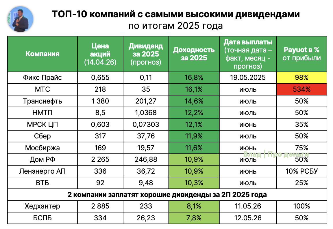 Сделал для вас ТОП компаний по дивдоходности за 2025 год. Обновил для вас ТОП-10 компаний, которые заплатят больше всего дивидендов за 2025 год на российском рынке (из тех 70, что покрываю аналитикой) + добавил 2 компании с хорошими дивидендами за 2 полугодие. · Среди лидеров 5 банков, 2 транспортные, 2 сетевые компании и 3 специальных ситуации (Фикс Прайс, МТС и Хедхантер). · В Фикс Прайсе и МТС следующие дивиденды в таком же объеме – под большим вопросом; · В банках осталась интрига в ВТБ (думаю, payout будет ближе к 25% от прибыли); · Почему доходность Сбера выше доходности Дом РФ (за что премия?); · Транснефть и НМТП — хорошие дивиденды и там, и там, но следующий у Транснефти будет ниже в %, чем у Сбера, у НМТП — флэт. Наличие высокого дивиденда — не обязательно означает большую недооценку. Среди этих 12 компаний в моем портфеле есть только 2. При этом, крепких качественных компаний в этом списке много (две трети). Мои актуальные обзоры этих компаний вы можете прочитать по ссылкам