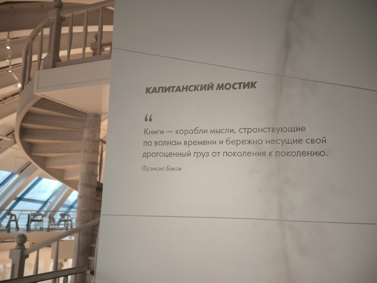 Книги – это корабли мысли, странствующие по волнам времени и бережно несущие свой драгоценный груз от поколения к поколению - Френсис Бэкон У корабля обязательно есть капитанский мостик – место, откуда обычно открывается максимальный обзор акватории для проверки курса, выбранного штурманом. Мостиком корабля «Планета Океан» служит библиотека, где представлены знания, собранные в научных экспедициях. Здесь наиболее полно раскрывается уникальная архитектура здания: высокий потолок образован смыканием серповидных колонн, его купол исполнен в виде Северного полюса, а панорамные окна позволяют насладиться великолепным видом на город и Набережную исторического флота. Ярким элементом читального зала стало монументальное панно в семи частях авторства Генрики Барткуте, раскрывающее тему зарождения жизни на планете.