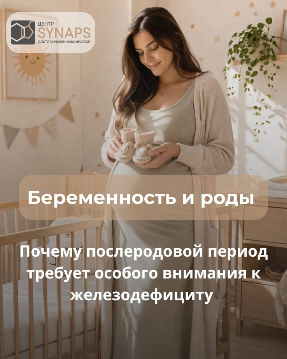 🟩 Во время беременности возрастают потребности в железе. В родах возможна кровопотеря, после родов долго сохраняются нарушение сна, хроническое чувство усталости, а при грудном вскармливании ресурсы восстановления ограничены. В результате формируется состояние, в котором гормональная перестройка, депривация сна и психоэмоциональная нагрузка взаимно усиливаются. 🟩 Молодая мама спустя несколько месяцев после родов говорит, что 🟩у нее как будто закончилась жизненная энергия, 🟩она заботится о ребенке, но делает это через постоянное усилие, 🟩стала более плаксивой, тревожной, внутренне хрупкой, 🟩даже когда удается поспать, сон не дает чувства отдыха, 🟩тяжело собраться с мыслями, трудно радоваться, появляется вина из-за ощущения, что она не справляется. 🟩 При таких симптомах важно предположить послеродовую депрессию. Но столь же важно оценить, не является ли частью этой картины послеродовая анемия или истощение запасов железа после беременности и лактации. 🟩 Эта связь хоршо показа