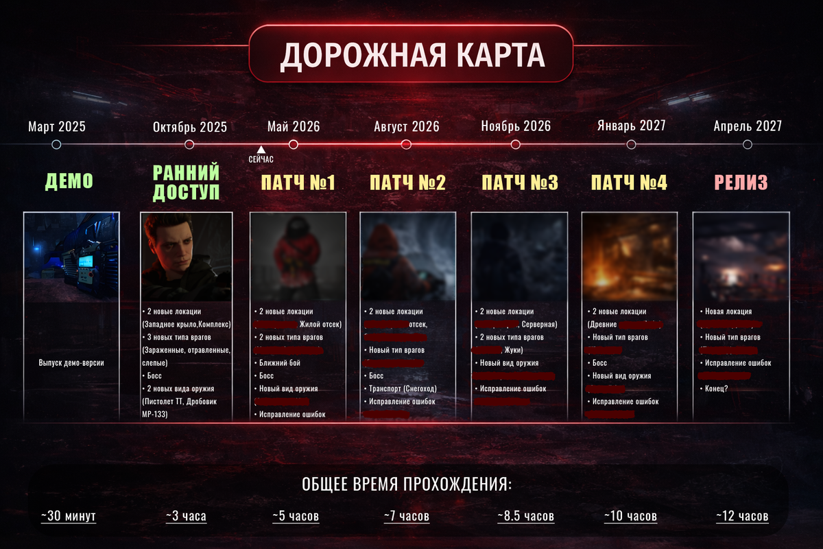 Вчера мы анонсировали дату первого крупного обновления нашего хоррора The Black Ice, которое выйдет 25 мая. А сегодня готовы показать вам дорожную карту проекта! The Black Ice - это survival-хоррор, действие которого разворачивается в Антарктиде. Исследуйте зловещий комплекс, разгадайте его тайны и постарайтесь выжить, прежде чем тьма поглотит вас. Не будем раскрывать все карты и часть вещей пока оставим в тени, но ключевыми моментами уже можем поделиться. Впереди вас ждет: развитие механик, новые элементы геймплея, новые враги, локации и, конечно, больше напряжения и неожиданных моментов. Ранний доступ уже доступен!