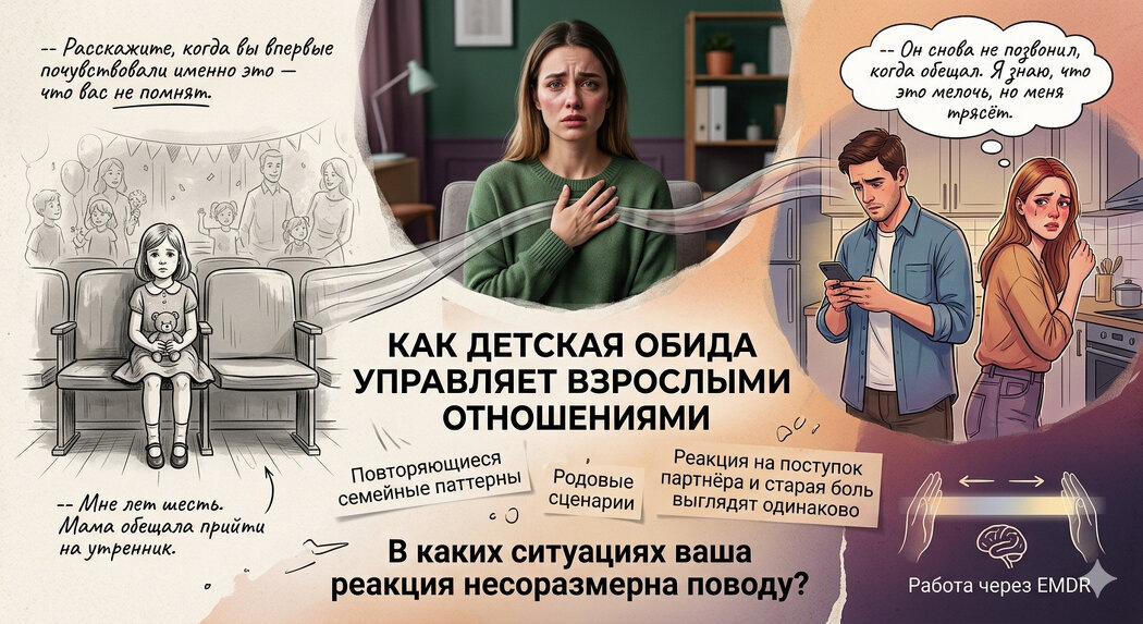 Пауза. Долгая. Потом тихо: — Мне лет шесть. Мама обещала прийти на утренник. Реакция на поступок партнёра и реакция на старую боль — внешне выглядят одинаково. Трясутся руки, подступают слёзы, внутри поднимается что-то огромное — несоразмерное поводу. Именно это несоответствие между ситуацией и силой реакции — первый сигнал, что здесь говорит не взрослый человек. Здесь говорит ребёнок, которому когда-то было очень больно. Детские обиды не исчезают с возрастом. Они просто уходят вглубь и ждут подходящего момента. Момента, когда кто-то близкий сделает что-то похожее — не позвонит, не заметит, не придёт, не выберет. И тогда психика мгновенно склеивает настоящее с прошлым. Партнёр опоздал на ужин — а тело уже реагирует так, будто снова шесть лет и мамы нет на утреннике. В работе через EMDR я прошу человека удержать в голове и нынешнюю с