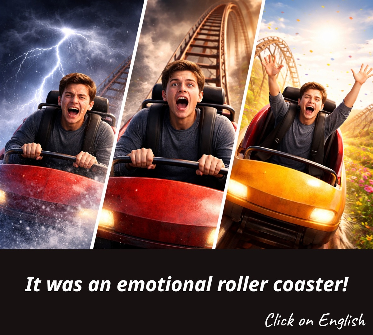 🎢 an emotional roller coaster (also - a roller coaster of emotions) — эмоциональная встряска, эмоциональные качели, буря эмоций 📕 Дословно: "эмоциональные американские горки" 🔊 /ən ɪˈməʊʃənl ˈrəʊlə ˌkəʊstə/ 🤔💭 Почему "roller coaster", а не "mountains"? Термин "roller coaster" появился в конце 19 века и относился к аттракционам, в которых тележки с роликами (rollers) катились (coast - двигаться по инерции) по рельсовому пути (coaster - тот, кто катится). 📖роликовая (roller) + тележка, катящаяся по инерции (coaster). В переносном смысле сегодня это общепринятая фраза в медиа, психологии и повседневной речи для описания интенсивных эмоциональных перепадов. ☝️🤓 Как запомнить? Представьте себя в вагончике аттракциона. Когда он едет вверх — вы улыбаетесь🤩, когда летите вниз — кричите от ужаса😱. Это и есть "emotional roller coaster"🎢. 📑Common Collocations📑 ⚫️ to be on / go through / ride an emotional roller coaster ⚫️ to send / take / put someone on an emotional roller coaster ⚫