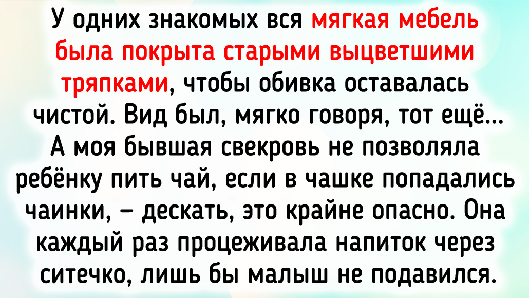 У одних знакомых вся мягкая мебель была покрыта старыми выцветшими тряпками, чтобы обивка оставалась чистой. Вид был, мягко говоря, тот ещё... А моя бывшая свекровь не позволяла ребёнку пить чай, если в чашке попадались чаинки, — дескать, это крайне опасно. Она каждый раз процеживала напиток через ситечко, лишь бы малыш не подавился. Когда я здраво заметила, что ребёнок прекрасно жуёт твёрдую еду и куда скорее может подавиться той же гречкой, она возражала: мол, за чаем человек расслабляется, не ждёт подвоха и поэтому рискует подавиться. © Doctor Whatwho / Dzen