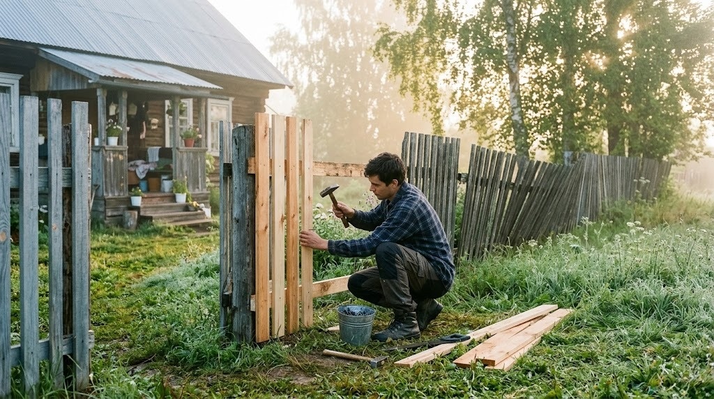 Воздух был холодным, обжигающим лёгкие. Роса покрывала траву серебристым слоем. Он подошёл к забору. Вернее, к тому, что он начал вчера. Одна доска торчала, как памятник его неудаче.