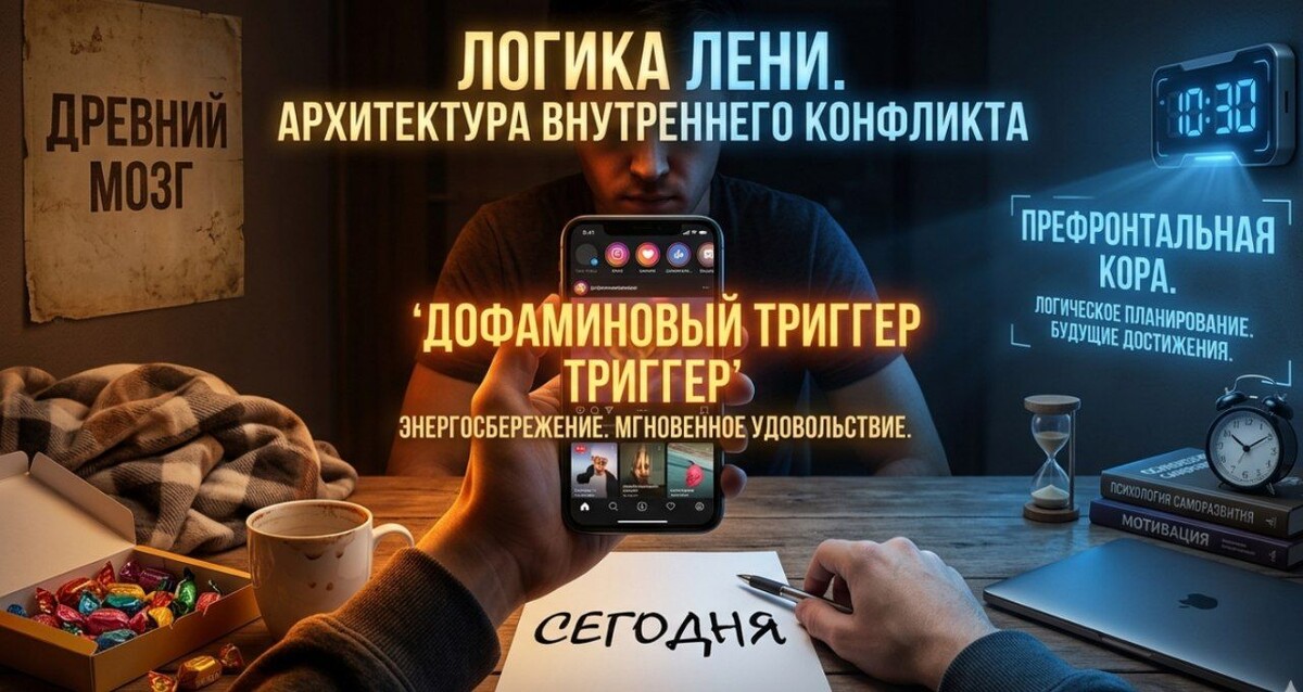 Конфликт возникает в момент выбора. Древний мозг тянет вас к комфорту и телефону. Префронтальная кора призывает к дисциплине. Этот внутренний разлад и есть то состояние, когда мы говорим про отсутствие сил.