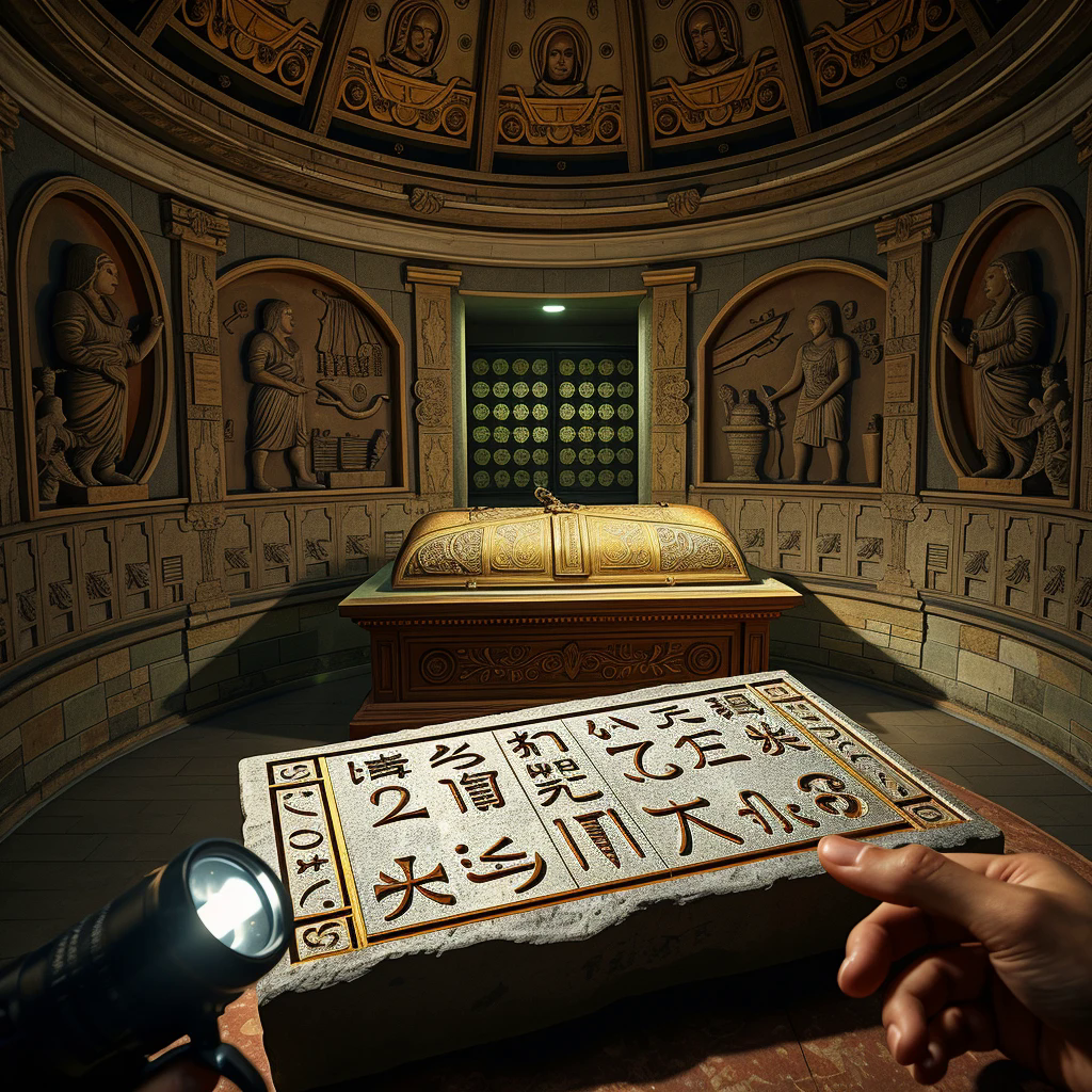 Я толкнул дверь – та открылась беззвучно. За ней простирался круглый зал с высокими колоннами. В центре покоился каменный саркофаг, покрытый символами. На крышке красовалась надпись на латыни: «Здесь спит тот, кто открыл врата. Его сон – печать. Его пробуждение – конец».