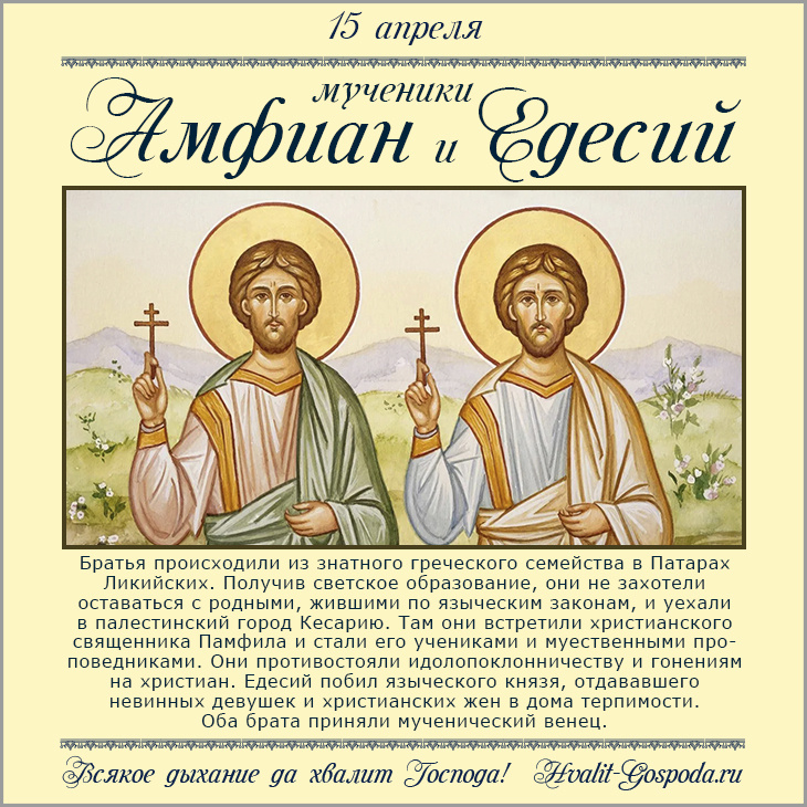 15 апреля – память святых братьев-мучеников Амфиана и Едесия (306 г.) Братья происходили из знатного греческого семейства в Патарах Ликийских. Получив светское образование, они не захотели оставаться с родными, жившими по языческим законам, и уехали в палестинский город Кесарию. Там они встретили христианского священника Памфила и стали его учениками и муественными проповедниками. Они противостояли идолопоклонничеству и гонениям на христиан. Едесий побил языческого князя, отдававшего невинных девушек и христианских жен в дома терпимости. Оба брата приняли мученический венец. Тропарь, глас 4 Мученицы Твои, Господи,/ во страданиих своих венцы прияша нетленныя от Тебе, Бога нашего:/ имуще бо крепость Твою,/ мучителей низложиша,/ сокрушиша и демонов немощныя дерзости./ Тех молитвами// спаси души наша. МОЛИТВА О МИРЕ И УКРЕПЛЕНИИ ВЕРЫ Мученики за Христа Амфиан и Едесий! Молите Бога о даровании нам покаяния и прощения грехов! Испросите у Него окончания войны между Россией и Украиной, примире
