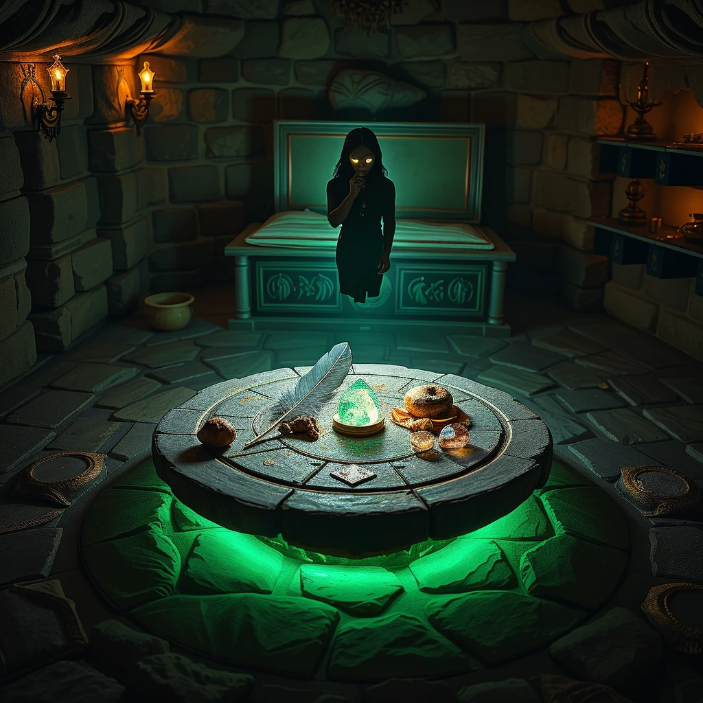 Из рюкзака явился кристалл. Едва он коснулся ложбинки, как плита вспыхнула ослепительным изумрудным пламенем. Из трещин в стенах хлынул туман, и в нём проступили слова, сплетённые из праха времён, — слова, что вдруг обрели смысл: