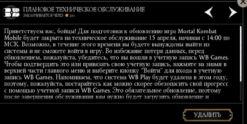 🔤🔤🔤🔤 Приветствуем вас, бойцы! Для подготовки к обновлению игра Mortal Kombat Mobile будет закрыта на техническое обслуживание 15 апреля, начиная с 14:00 по МСК. Возможно, в течение этого времени вы будете вынуждены выйти из системы и не сможете войти в игру. Во избежание потери данных, перед обновлением, пожалуйста, убедитесь, что вы вошли в учетную запись WB Games. Чтобы подтвердить это или привязать свою учетную запись, нажмите на знамя в верхней части главного меню и выберите кнопку “Войти” для входа в учетную запись WB Games. Напоминаем, что система WB Play будет удалена в этом году, поэтому, пожалуйста, постарайтесь как можно скорее обезопасить свой прогресс с помощью учетной записи WB Games. Это обязательное обновление, поэтому после завершения обслуживания вам нужно будет загрузить обновление и перезапустить игру. Сразу после технического обслуживания трафик на сервере, вероятно, будет довольно высоким. Если у вас возникнут проблемы с подключением, пожалуйста, повторите попы