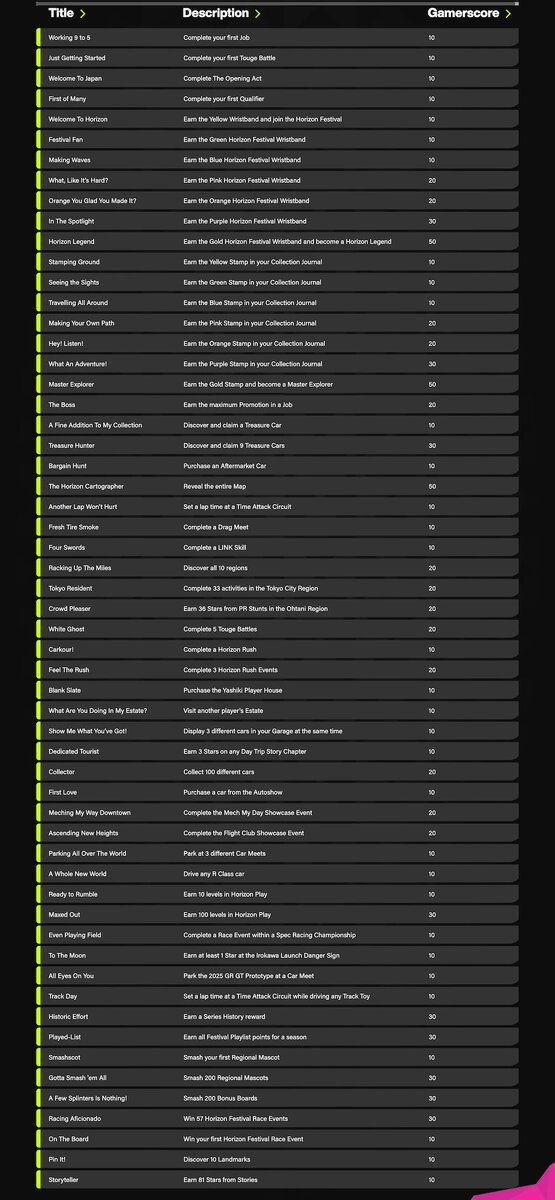 Разработчики из Playground Games заранее раскрыли список достижений для Forza Horizon 6. Уже сейчас игрокам доступны все 57 ачивок общей стоимостью 1000 очков Gamerscore — их можно будет начать открывать с первого дня после релиза. Судя по описанию, достижения охватывают практически все аспекты игры. Геймеров будут поощрять за участие в фестивале Horizon, сбор коллекционных предметов, покупку автомобилей и выполнение разнообразных активностей в открытом мире Японии. Отдельное внимание уделено исследованию карты — для полного прохождения придётся проехать по всем дорогам. Это традиционное испытание серии вновь вернётся и станет одной из ключевых задач для перфекционистов. Примечательно, что на старте в игре не будет достижений, связанных с мультиплеером. Такое решение может понравиться тем, кто предпочитает одиночный режим и не хочет зависеть от онлайн-соревнований. Впрочем, разработчики не исключают, что подобные испытания появятся позже вместе с обновлениями. Релиз Forza Horizon 6 зап