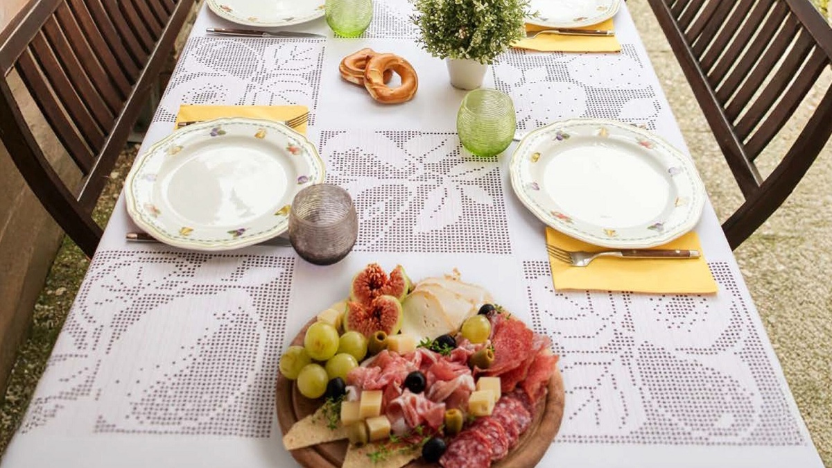 На фото выше мы видим скатерть, в которой чередуются мотивы вязаные в филейной технике. На каждом вязаном мотиве изображена ягода либо фрукт: клубника, лимон, возможно, слива и груша. Вязаные мотивы чередуются с мотивами из однотонной ткани, которые также можно заменить вязаными, например, обычной сеточкой или столбиками с накидом без какого-либо рисунка.