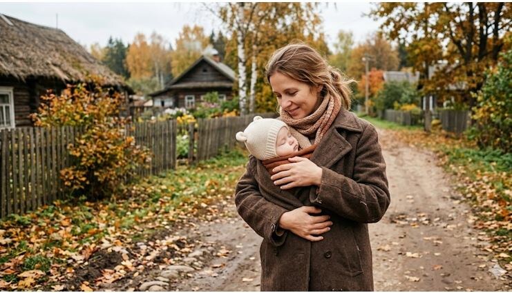 Ольга поправила на плече тяжёлую сумку. Руки затекли, спина ныла, но она почти не чувствовала физической усталости. Всё её существо было сосредоточено на маленьком комочке, спрятанном под старым демисезонным пальто. Тёмка, её трёхмесячный сын, спал, мерно посапывая в тепле. Ольга прижала его крепче, стараясь защитить от резкого порыва ветра, и медленно пошла по направлению к родному дому.