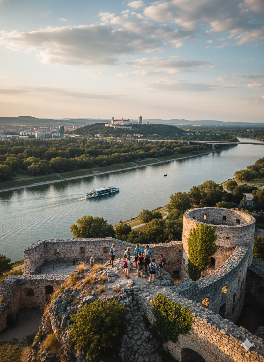 Руины на отвесной скале над слиянием Дуная и Моравы — это не просто живописные развалины, а один из главных символов словацкой национальной идентичности. Место невероятной красоты: с вершины холма одновременно видна и Братислава, и Австрия за рекой, и далёкие отроги Малых Карпат.
