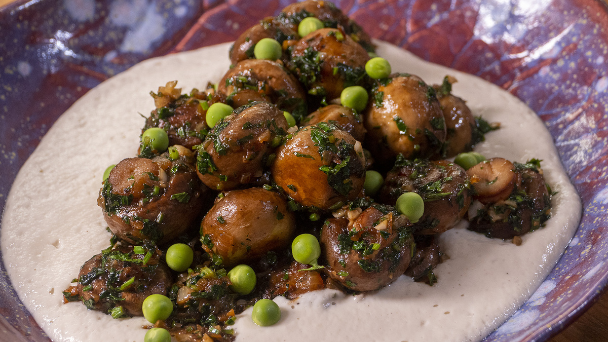 Ингредиенты: • Цветная капуста • Шампиньоны (25–30 шт) • Сливки • Чеснок (7–9 зубчиков) • Лук (1 шт) • Сливочное масло • Растительное масло • Бальзамический уксус • Соль, перец • Сушёная мята (несколько щепоток) • Петрушка свежая • Кунжут жареный • Стручковый зелёный горох (для подачи) Приготовление: Чеснок мелко нарезаем. Цветную капусту делим на соцветия, кладём в кастрюлю, заливаем сливками. Солим, перчим, добавляем ~30 г сливочного масла. Готовим на слабом огне ~15 минут.Если сливки выпариваются — добавьте немного горячей воды. На сковороде разогреваем сливочное масло + немного растительного. Обжариваем мелко нарезанный лук, затем добавляем грибы. Помешиваем, вливаем немного растительного масла и добавляем 1/3 чеснока. Пока грибы жарятся, нарезаем петрушку. В грибы добавляем бальзамический уксус, сушёную мяту и соль. Перемешиваем. Когда грибы готовы — добавляем оставшийся чеснок и петрушку, быстро прогреваем и снимаем с огня. Капусту со сливками перебиваем блендером до кремовой тек