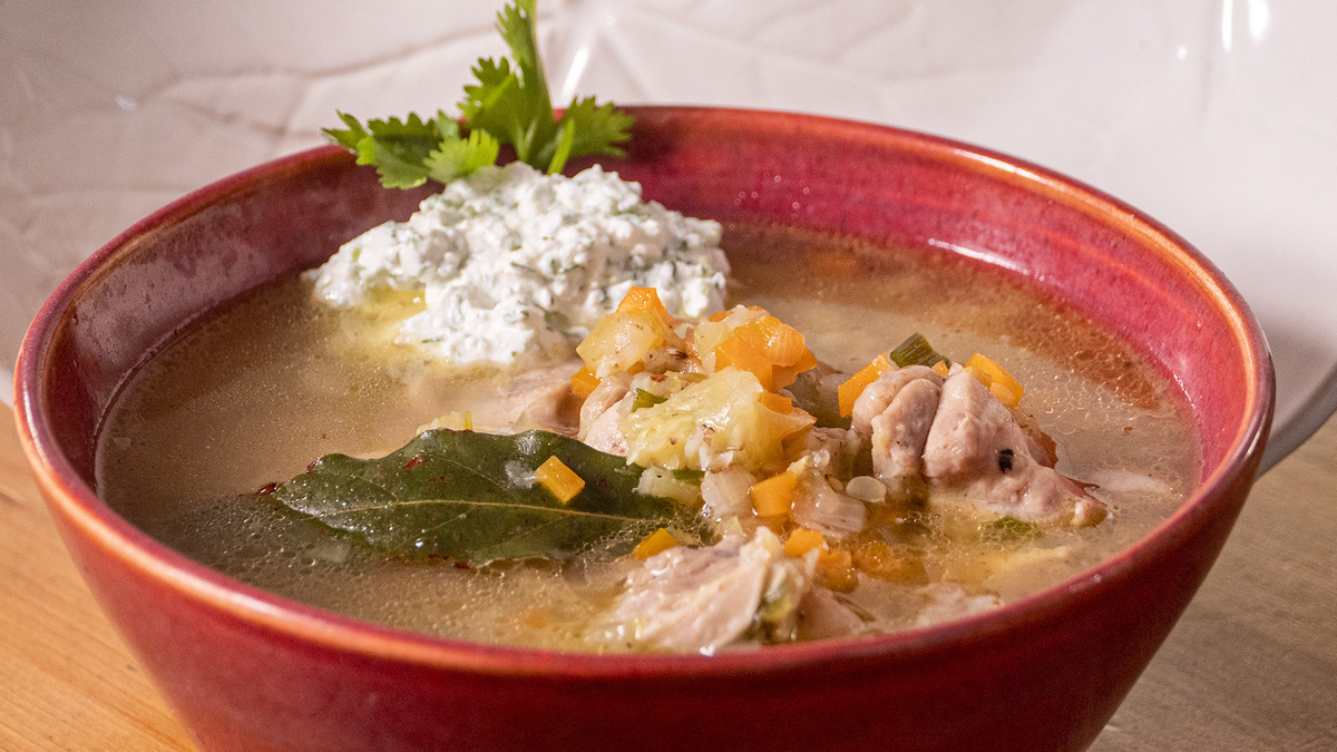 Ингредиенты: Куриный окорочок — 1 шт Лук — 1 шт Морковь — 1 шт Сельдерей — небольшой кусочек Зелёный лук — немного Семена кабачка — от 2 шт Сливочное масло — 1 ст. л. Лавровый лист — 1 шт Тмин — щепотка Тимьян — щепотка Соль — по вкусу Мускатный орех — щепотка Вода — 1–1.5 л Кинза — небольшой пучок Укроп — несколько веточек Чеснок — 1 зубчик Овсяные отруби — 1–2 ст. л. Гречневые хлопья — 1–2 ст. л. Сыр фета — 1 ст. л. Чёрный перец — по вкусу Лимонный сок — по вкусу Приготовление: Курицу отделить от костей, нарезать Обжарить мясо с луком 2–3 мин Добавить морковь, сельдерей, зелёный лук Добавить кости и семена кабачка Посолить, добавить лавровый лист Добавить тмин, тимьян, мускат Залить водой, варить ~20–30 мин (снимать пену) Добавить сливочное масло и перец Всыпать немного отрубей и хлопьев, варить 2 мин Добавить лимонный сок Зелень + чеснок + фета — мелко нарезать и смешать Подавать суп с заправкой.