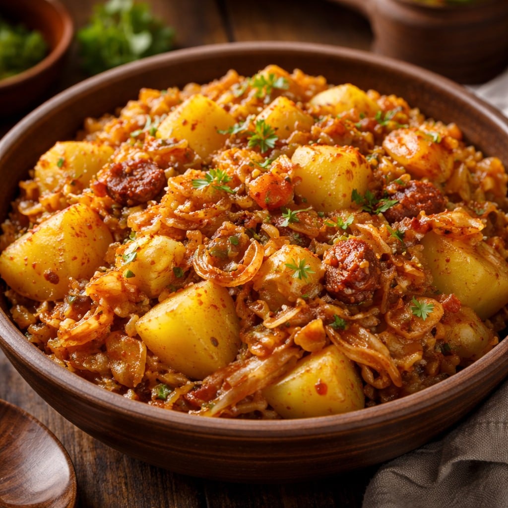 Ингредиенты: Капуста — 500 г Картофель — 400 г Лук — 1 шт. Растительное масло — 2 ст. л. Соль, чёрный перец Щепоть паприки или сахара (по желанию) Как делает Гаврила: Лук обжарил. Добавил капусту и тушил 10 минут. Вмешал картофель кубиками. Посолил, поперчил. Тушил под крышкой ещё 15–20 минут. Сытно, просто и честно. Без лишних разговоров.