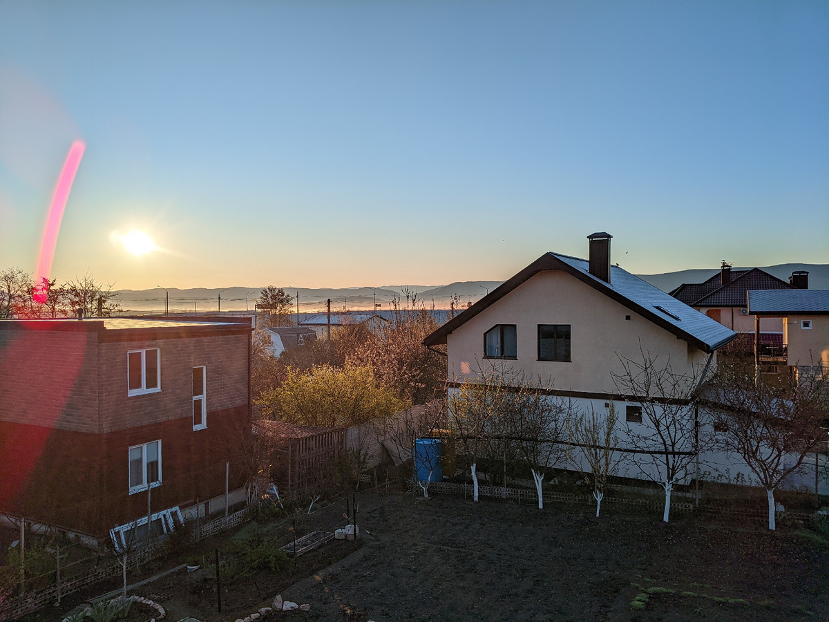 Утро началось в 6-00 с треньканья будильника, сегодня у нас опять поездка в Балаклаву на перевязку. Погода почти замечательная, если смотреть в окно, солнечная, но с морозной изюминкой. Крыши домов в изморози, покрылись белым инеем. На фото, солнечным фломастером, проведена загадочная розовая стрелка. Быстро со Светланой позавтракали и в путь. Автобус прибыл вовремя, строго по расписанию. До Балаклавы добрались тоже очень быстро, зашли в больницу, я как всегда остался сторожить куртку Светланы и следить за развитием событий на бирже. А что ещё делать в больнице?! Благо сегодня чубатые не проявляли с утра больших интересов к нашему региону и интернет работал отлично. Ждать долго не пришлось, уже через час-полтора вышла сияющая Светлана и сообщила, что наша медицинская эпопея с миссией в Балаклаве вышла на финальную линию и сегодня закончилась. Ну и на этой радостной ноте мы поехали обратно. Ура! Закончились ранние утренние побудки, можно теперь снова выспаться. Домой приехали, а нас