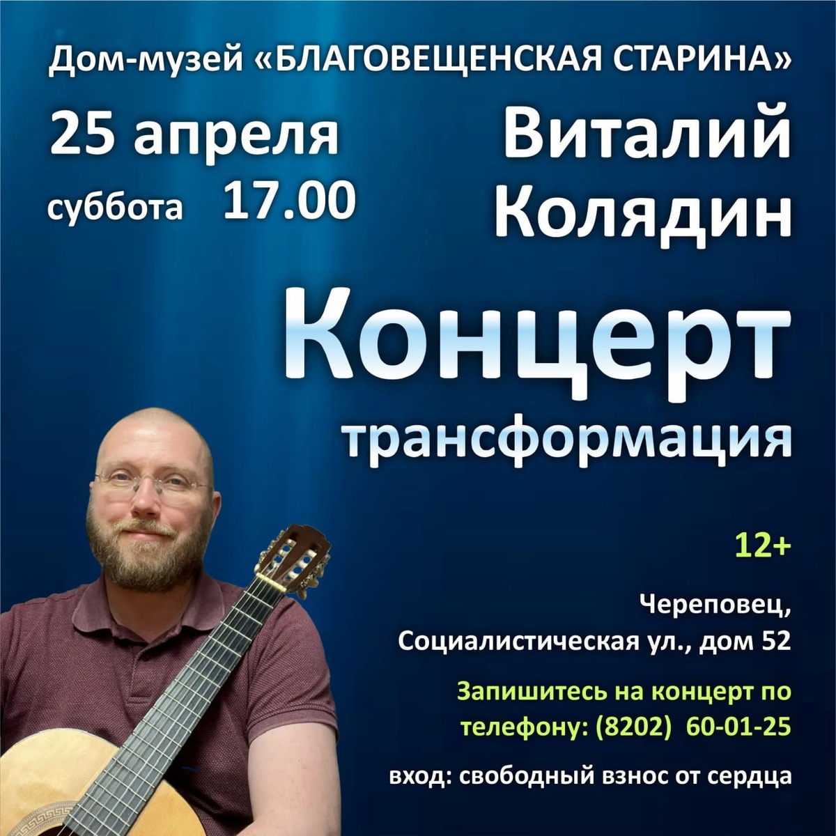 в субботу, 25 апреля 2026, в 17.00 Это музыкальное путешествие к себе настоящему. Так я решил отметить день рождения в 2026 году :) Место проведения: Дом-музей "Благовещенская старина". Череповец, Социалистическая, 52 Количество мест ограничено, всего 50. Запишитесь на концерт по телефону: (8202) 60-01-25 Вход: свободный взнос от сердца.
