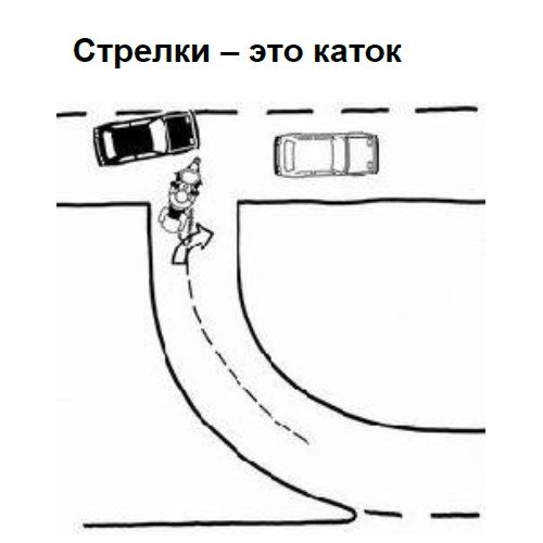 Эти стрелки на дороге – скользкие как лед В наклоне съезжаете с автострады. Съезд кончается, вы должны уступить дорогу. Аккуратно притормаживаете, мотоцикл понемногу выпрямляется, сильнее давите на рычаг тормоза. Вдруг переднее колесо теряет сцепление с дорогой начинает скользить в сторону. Отпускаете передний тормоз, чтобы избежать падения, и зад мотоцикла тут же начинает вилять. Продолжаете давить на задний тормоз, чтобы избежать хайсайда, удерживаетесь на колесах, останавливаете мотоцикл. - Стрелки на асфальте, которые указывают направление, делают из специального износостойкого материала на основе пластика. Они становятся предательски скользкими, как только на них попадет хоть немного масла или воды. Выбирайте траекторию движения так, чтобы не наезжать на них. Если это невозможно, энергично, полностью гася скорость, тормозите перед ними и отпускайте тормоза, как только на них въедете.