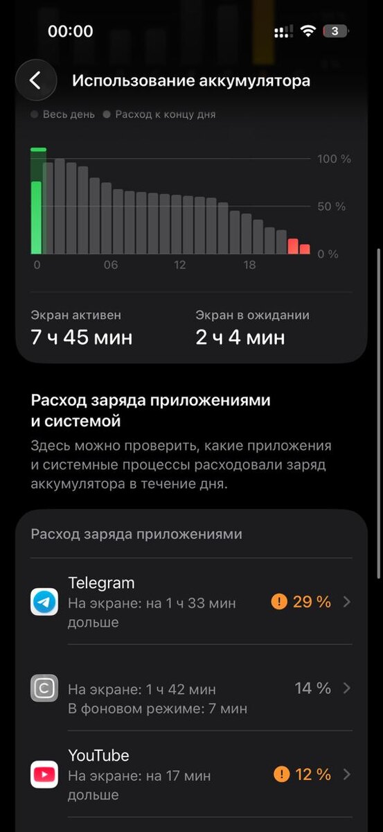 ⚡️Автономность iOS 26.5 Beta 2 Снял с зарядки в 02:26 и активно пользовался до 06:00 утра, а потом с 15:00. В итоге в 00:00 оставалось 3%. По условиям все стандартно для меня: LTE на двух симках, вайфай/сотовая сеть 50/50 по времени. Яркость 50%. Как обычно соцсети, браузер, ютуб, навигация. Айфон 17 Про, емкость аккума 100%. Always On и 120гц включены. В итоге чуть более 7,5 часов экрана. Примерно, как на первой бете. Как у вас?🤔