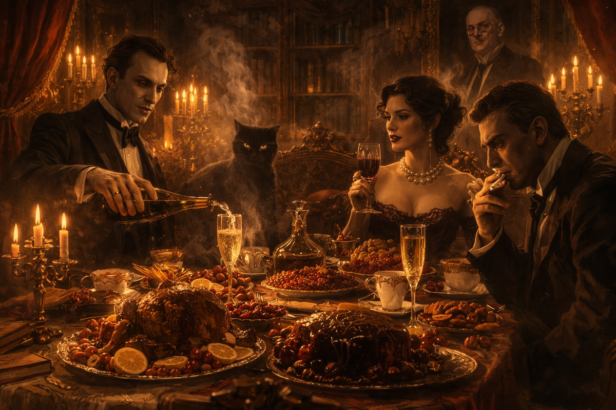 Бал у сатаны обычно соблазняет сильнее всего. Там хочется говорить о роскоши: свечи, музыка, гости, тяжелые ткани, вино, темное мясо, гранат, вишня, шоколад, серебро, красный отсвет на бокалах. Для обложки и домашнего вечера почти идеально.