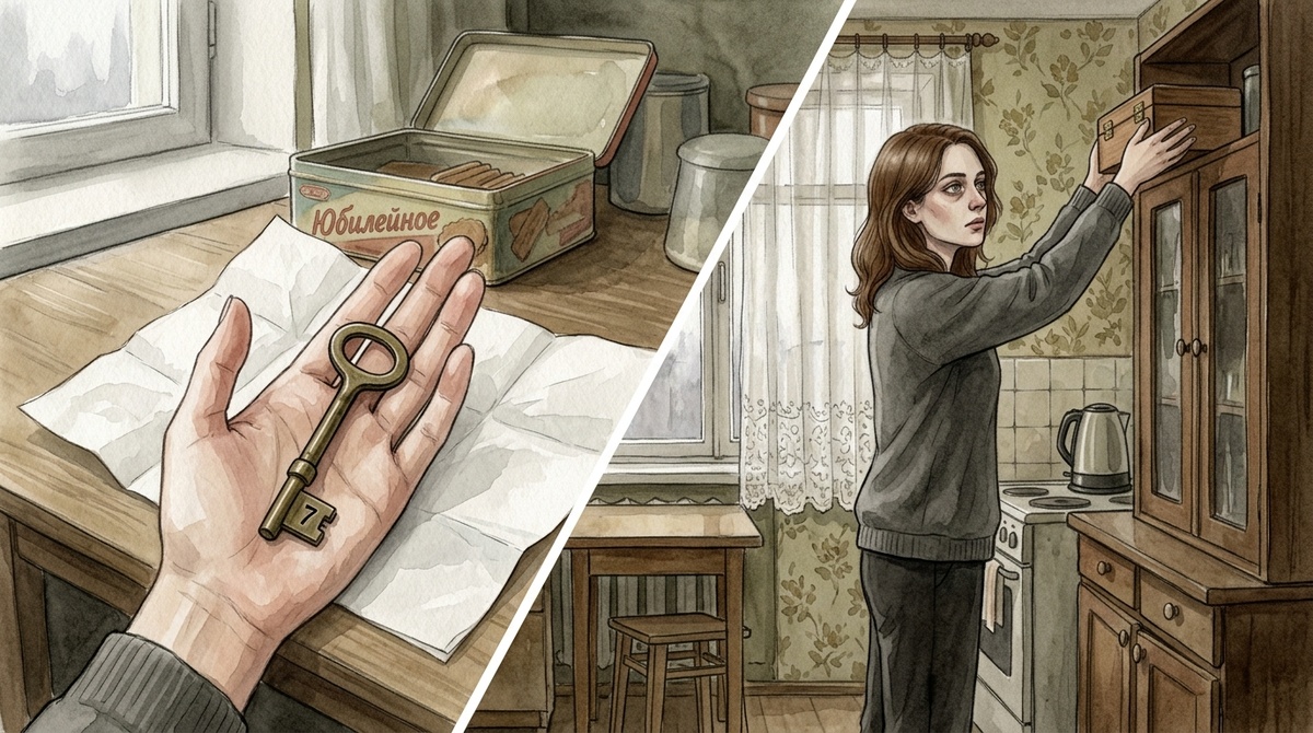 Ключ лежал в шкатулке двадцать пять лет. Не в сейфе, не в конверте — в старой жестяной коробке из-под печенья, завёрнутый в трёхслойную салфетку.