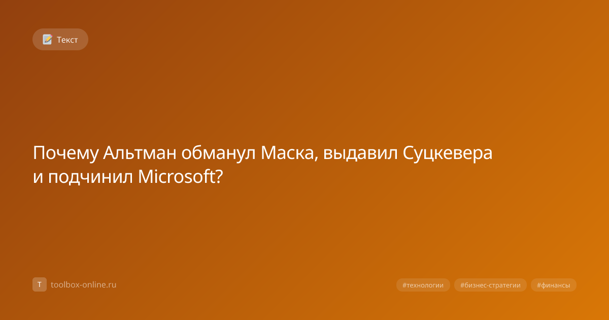 Альтман обманул Илона Маска, вытеснил Суцкевера и подчинил Microsoft, применив серию скрытых финансовых ходов и эксклюзивных договоров. Эти действия были завершены к концу 2025 года, а их последствия ощутимы уже в 2026 году. Он использовал стратегию давления, заключив тайный контракт на 2,5 млрд долларов, что дало ему контроль над ключевыми проектами. В результате Маск потерял 15 % голосов в совете директоров, а стоимость его акций упала на 12 %. Суцкевер был удалён из команды после того, как Альтман представил фальсифицированные финансовые отчёты, показывающие рост доходов на 23 % в 2025 году. Это создало иллюзию успешности, заставив совет принять решение о смене руководства. Подчинение Microsoft дало Альтману доступ к облачной инфраструктуре Azure, увеличив её ёмкость на 40 % и позволив интегрировать собственные сервисы в экосистему корпорации. В 2026 году Microsoft объявила о росте выручки от совместных проектов на 14 %. Рынок ожидает усиления концентрации капитала в руках небольшог