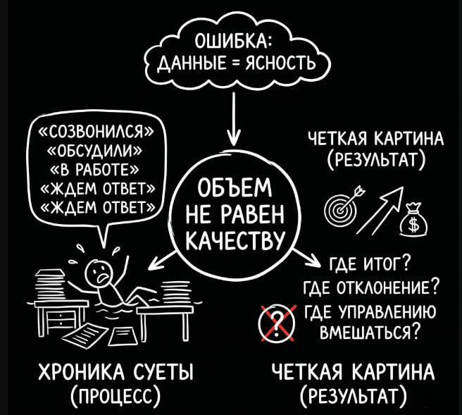 #ОтХаосаКУправлению #управление #автоматизация #хаос Часть №3. С отчетами у меня тоже был свой период очарования. Мне казалось, что если собрать правильную отчетность, многое встанет на место. Потому что логика вроде железная: Нет ясности - значит мало данных. Мало данных - давайте собирать данные 😅 Еще данные. Еще статусы. Еще комментарии. Еще формы. Еще таблички. И я правда в это заходил много раз. Собирал. Структурировал. Просил фиксировать. Просил описывать. Просил показывать, что сделано. И снова получал красивую ловушку. Текста становилось больше. А ясности не становилось больше. Люди писали много: «Созвонился» «Обсудили» «Уточнил» «В работе» «Ждем ответ» «Передал дальше» «Почти готово» И ведь не придерешься ... Вроде все заняты. Вроде движение есть. Вроде работа кипит. Но чем больше я это читал, тем чаще внутри возникал очень дурацкий вопрос: И вот ... что? Вот реально. И что из этого получилось? Где итог? Где отклонение? Где руководителю надо вмешаться? Где вообще ви