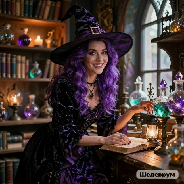И только она открыла дверь, как к ней сразу подбежала женщина в темно-фиолетовом платье, с фиолетовыми волосами и в фиолетовой остроконечной шляпе.