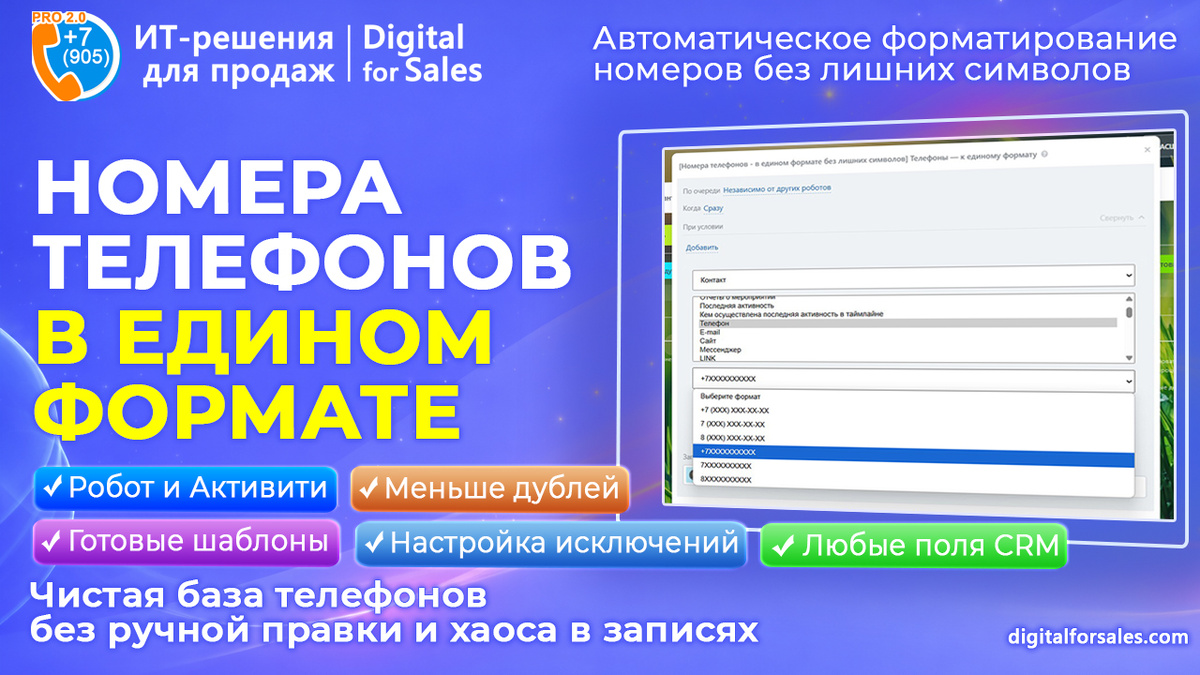 Оно автоматически приводит все телефонные номера в CRM к единому виду по выбранному шаблону, убирая лишние символы и нормализуя запись. Где можно использовать форматирование телефонов?
