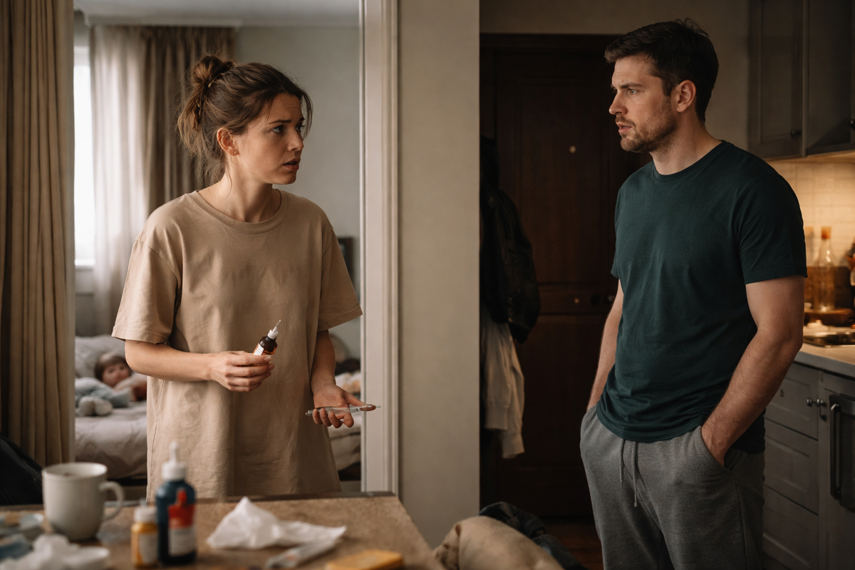 Я стояла у раковины, споласкивала мерный шприц из-под нурофена, и теплая вода текла по пальцам липкой струйкой. На подоконнике сохла детская кружка с облупившейся лисой, на батарее висели два маленьких носка - мокрые после ночной рвоты, я их застирала на автомате, не глядя. В кухне пахло жареным луком, лекарством и влажным полотенцем. Из комнаты то и дело доносился тяжелый, рваный кашель Артема, а у Маши опять начинала подниматься температура - я это уже по глазам видела, по тому, как она дышала ртом и теребила край пледа.