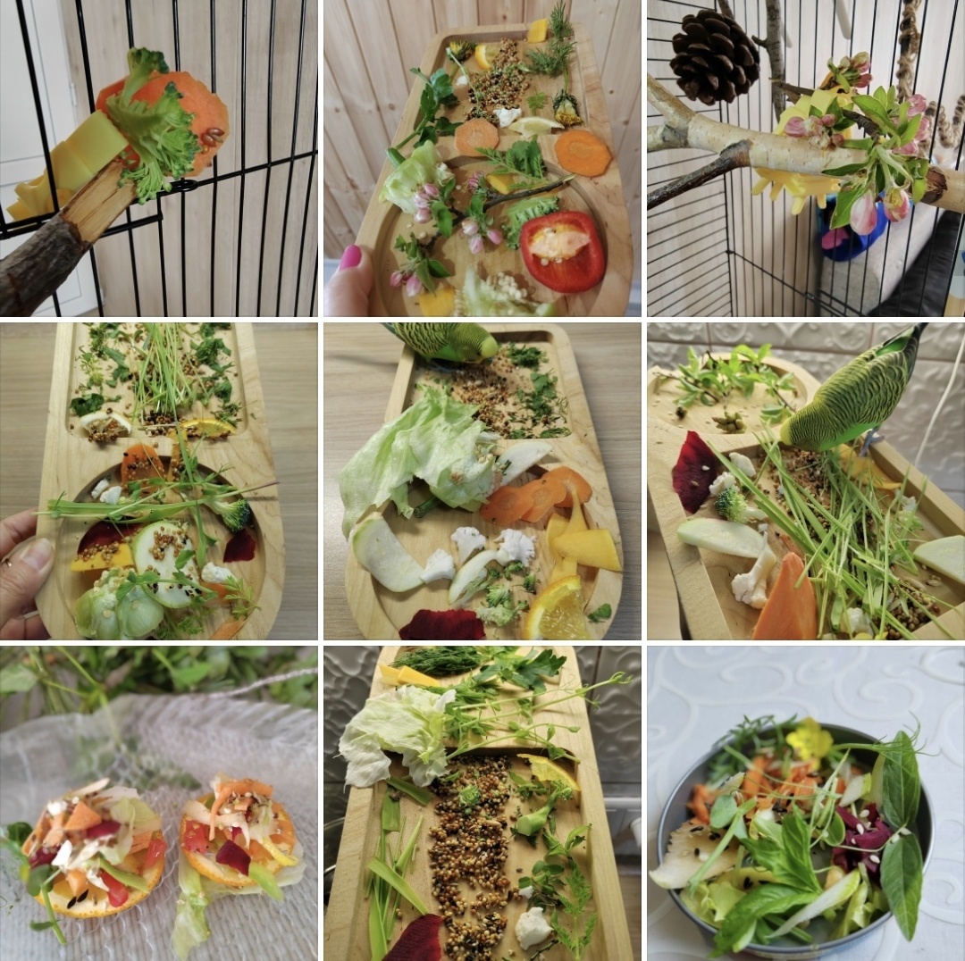 Когда были время/желание и была только маленькая клетка-малышка оформляла на крышечки мелкое, а всё, что покрупнее прищепками возле жердочек.