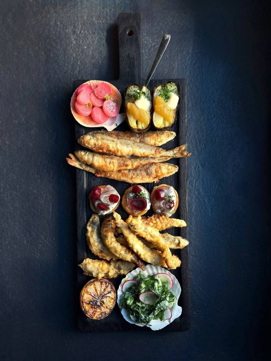 ». Царь-рыбку сервируют на компанию до конца апреля. На доске — корюшка в разных кондициях: обжаренная в темпуре и в классической панировке из муки, а также запеченный картофель в углях с щучьей икрой и сливочным маслом, маринованный редис, зеленый салат и оладьи с анчоусами из корюшки. Стоимость сета: 3700 руб. Виленский переулок, 15 +7 (931) 266-77-22