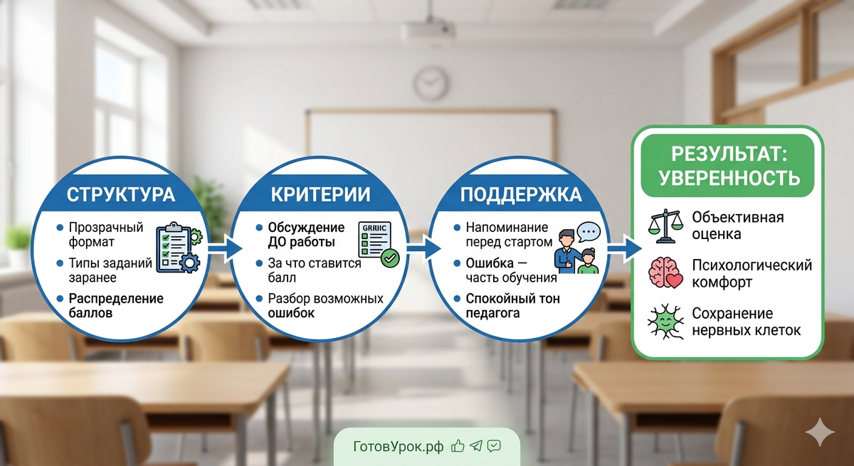 До начала работы мы обсуждаем, за что ставится балл, а где возможна ошибка. Это смещает фокус с «как бы не получить двойку» на «как выполнить задачу правильно». 3. Психологическая поддержка