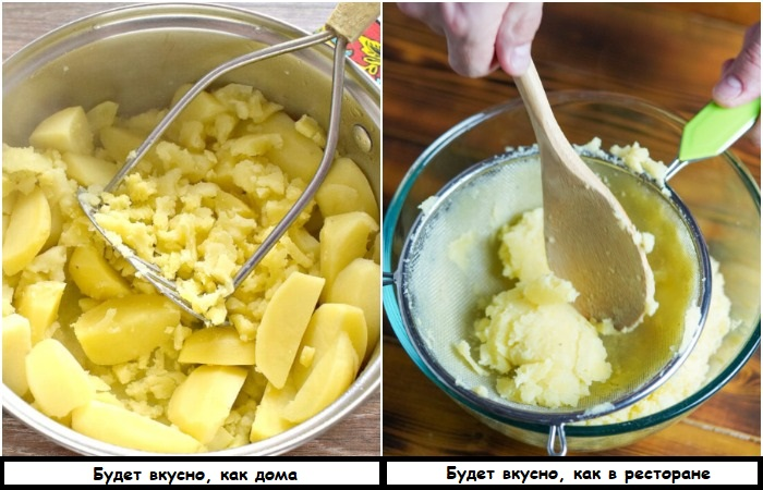После того, как вы измельчили картофель, протрите его через мелкое сито. Да, на это придется потратить много времени и усилий, но результат того стоит. Когда вы используете сито, в картофельную массу проникает больше воздуха, благодаря чему она становится похожей на крем. У вас получится пюре, как в ресторане – легкое, нежное, воздушное, с идеально гладкой консистенцией.