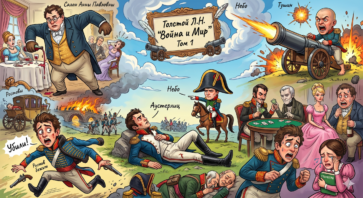 Сегодня у нас на столе под скальпелем пересказа - первый том "Войны и мира" Льва Николаевича Толстого. Того самого, который написал кирпич на 1300 страниц, где пол тома описания дуба, а потом выясняется, что дуб - это метафора. Но мы не будем скучать. Мы будем смеяться, иронизировать и проклинать всех, кто говорит "наполеоновские планы".